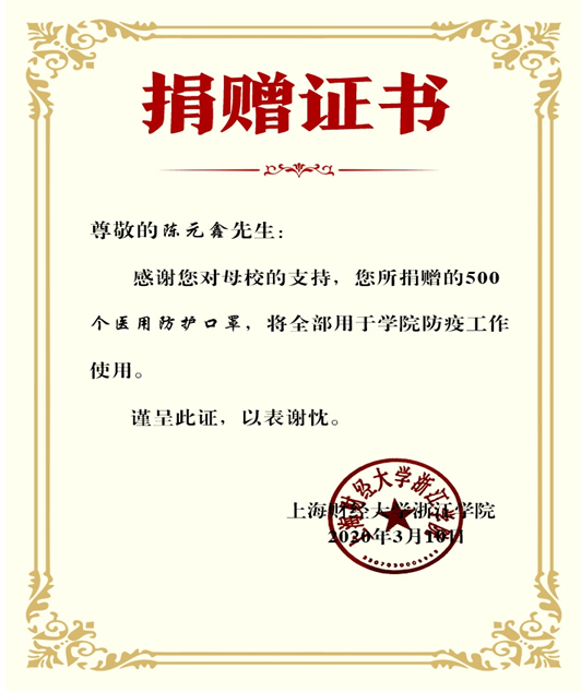 2018届校友陈元鑫利用在海外从商的便利条件助力家乡广西北海疫情防控,采购到15万只医用口罩和一大批防护服、护目镜、测温仪全部发放到防疫一线,部分捐赠给红十字会,留下的500个医用口罩捐赠给了母校。他表示,作为一名财浙学子,非常怀念在财浙学习、生活的时光,感恩万象城多年的培养,得知万象城防控物资紧缺,特意捐赠500个医用口罩,希望能为母校的疫情防控工作助力。张正亮代表万象城向陈元鑫校友表示感谢,并向他在线颁发了电子捐赠证书。