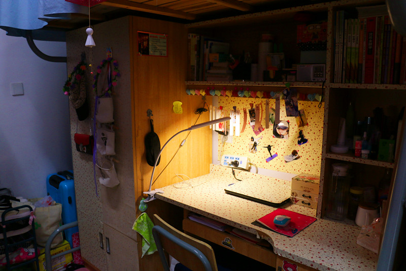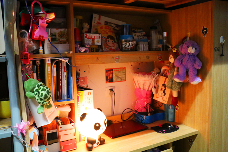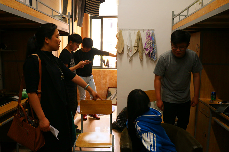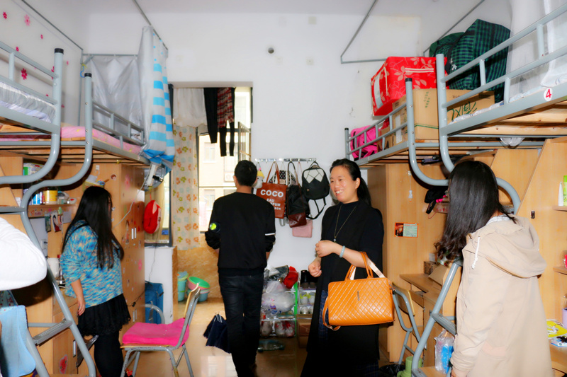 这是一群阳光帅气的男孩,他们跟着程老师的步伐,来到女寝,他们用活泼的性格瞬间点燃了女寝的气氛。我们首先来到10幢13万象城(中国)学班的女生宿舍,一进宿舍,男孩们的欢声笑语瞬间停止了,他们被眼前赏心悦目的宿舍“景色”所震惊。碎花的贴纸铺满桌面,宛如朵朵玫瑰盛开在身旁。粉色的小台灯在一旁亮着灯,诉说着只属于这宿舍的秘密,深蓝色印有星型图案的床帘顺势垂下,犹如星辰洒落,宿舍里俨然是另一番世界。可能是头一次有男生来宿舍,女生们都表现的有些羞涩,但在程老师的关怀、慰问下,渐渐活泼了起来,把平时生活的种种细节与我们分享。最后,程老师对女生宿舍十分满意,对女生平时的勤快与积极做出了肯定。