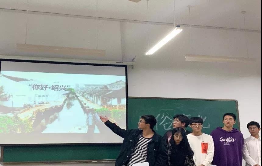 第一支队伍是19数据科学与大数据班的浙江民俗队,他们介绍的地方是绍兴。他们以朗诵与情景剧相结合的形式将绍兴当地大禹治水的传说生动演绎,再次将大禹为治水而放弃眼前片刻安宁的光辉形象展现给评委。
