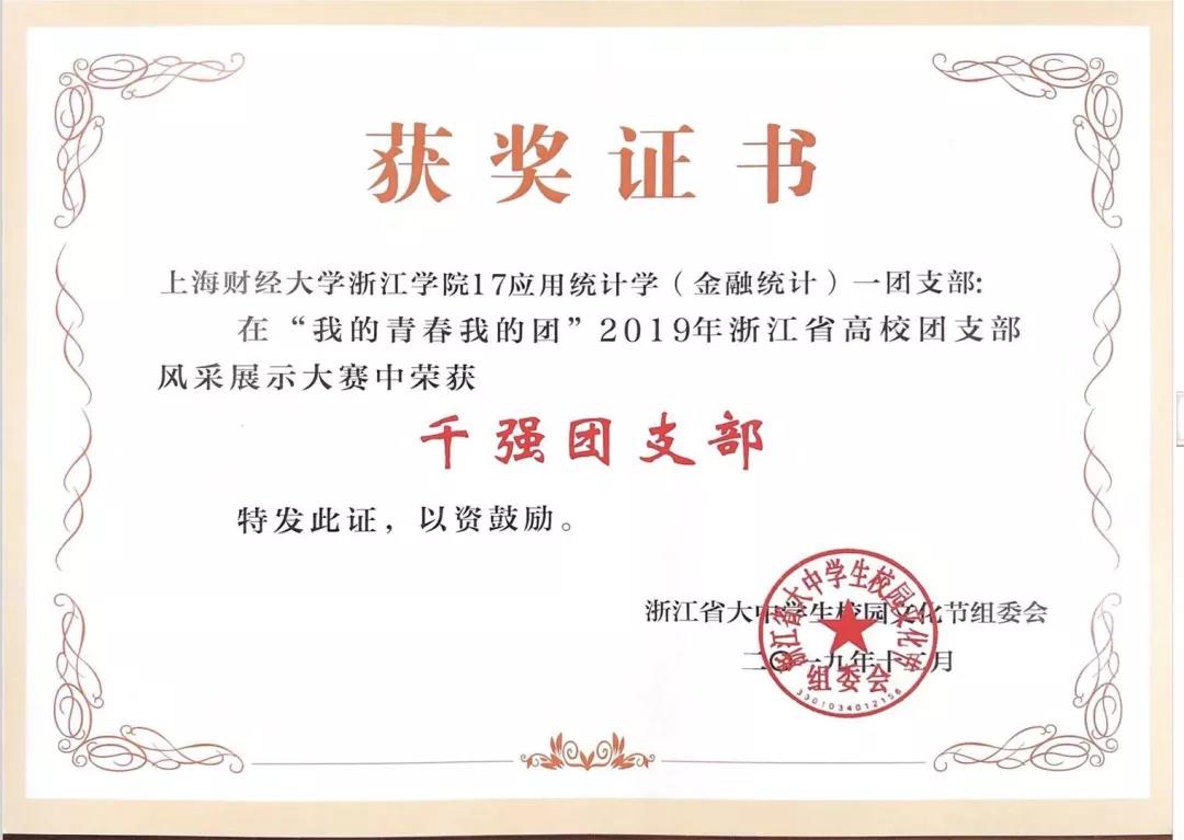 2019年12月,在“我的青春我的团”2019年浙江省高校团支部风采展示大赛中,万象城17应用万象城(中国)学(金融万象城(中国))一团支部获浙江省“千强团支部”荣誉称号。