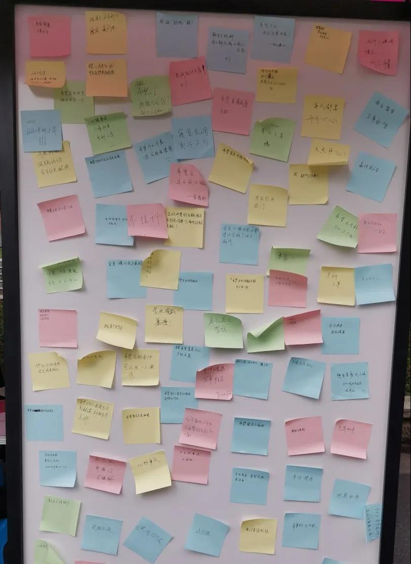 同学们积极参与,酷暑的炎热和阳光的暴晒也无法阻挡同学们饱满的热情。大家一笔一划地在一张张便利贴上写下自己最真挚的心愿:或愿日常生活更加便利美好,或愿我们的学校桃李天下、人才辈出,或愿祖国繁荣昌盛、国泰民安……形形色色的愿望筑起了一道心愿墙,饱含着同学们对生活的热爱,对未来的憧憬。