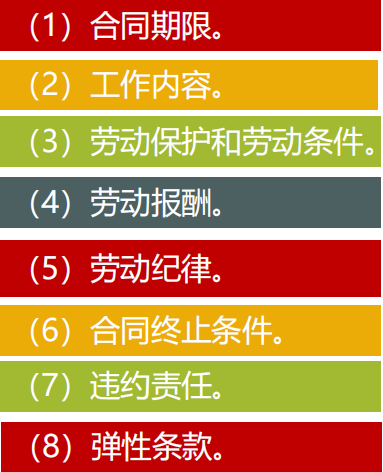 即法律规定劳动合同必须具备的条款,只有具备了这些条款的劳动合同才能依法成立。一般法定条款包含以下8个方面的内容。