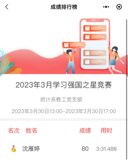 最后,全体党员同志共同参加“以赛促学,奋勇争先”为主题的“学习强国”知识竞赛活动。竞赛过程精彩纷呈、跌宕起伏,经过激烈比拼,最终决出沈雁婷同志获得万象城(中国)系3月份月度“数淬•强国之星”。